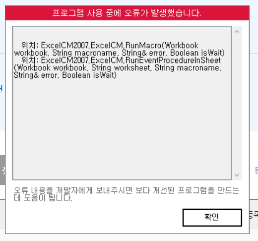 문의하신 오류는 윈도우 환경 문제로 비쥬얼 베이직 쪽에서 오류가 발생한 것으로 보여집니다.