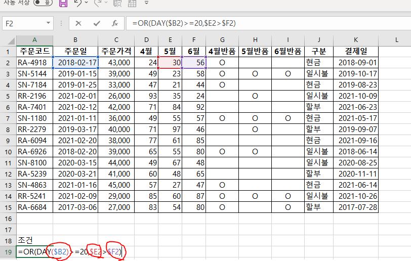 '주문일'이 20일 이후이거나 '5월'이 '6월'보다 큰 데이터 입니다.