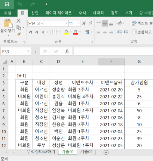 먼저 저희쪽 PC에서 해당 도서의 자료 다운 받아 섹션 17파일을 열었을때, 기출 01 시트 확인됩니다.