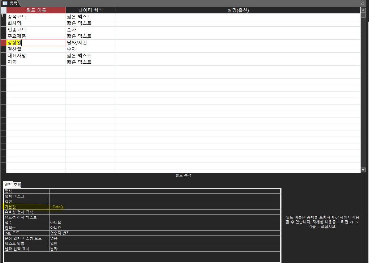 상장일 기본값에 "=Date()"로 작성해여 프로그램 오답 처리되었는데, 실제 데이터 표기는 오늘 날짜로 잘 표기되고 있습니다.