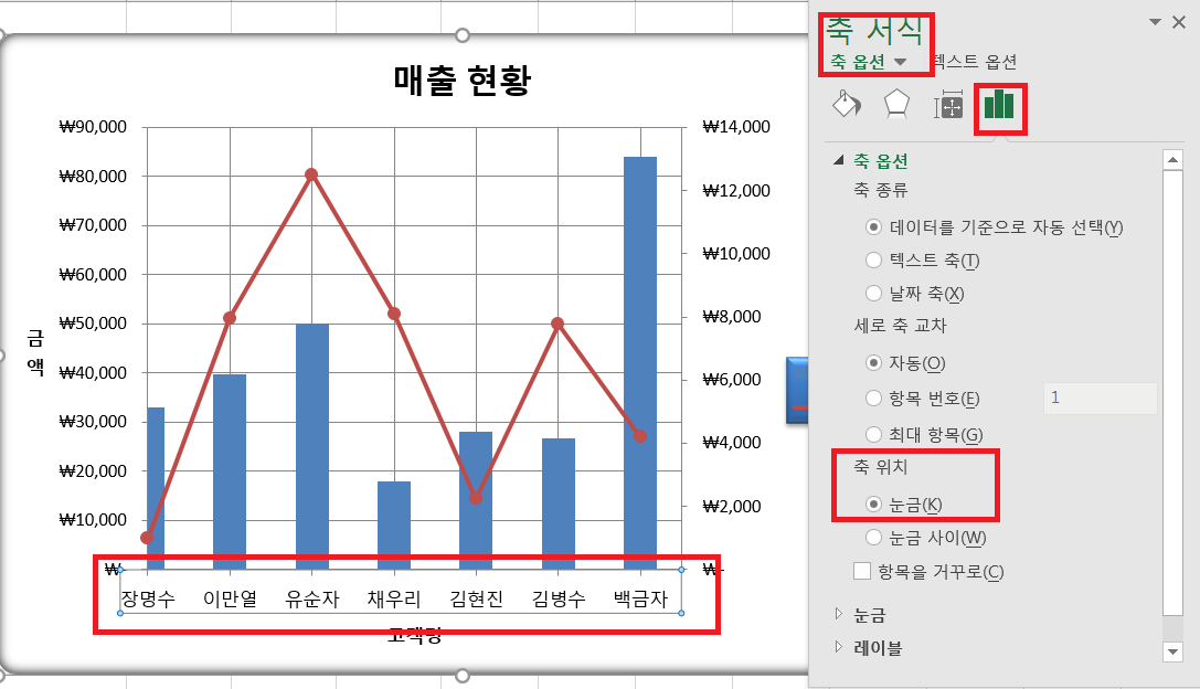 기본 세로 주 눈금선을 표시하고 가로축의 축 위치를 "눈금"으로 지정하시오.