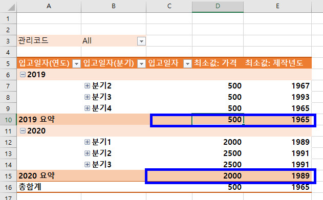 - 아래 그림에서 파랑색으로 표시한 부분과 같이 부분합(요약) 부분을 더블클릭하면 해당 데이터가 모두 표시됩니다.