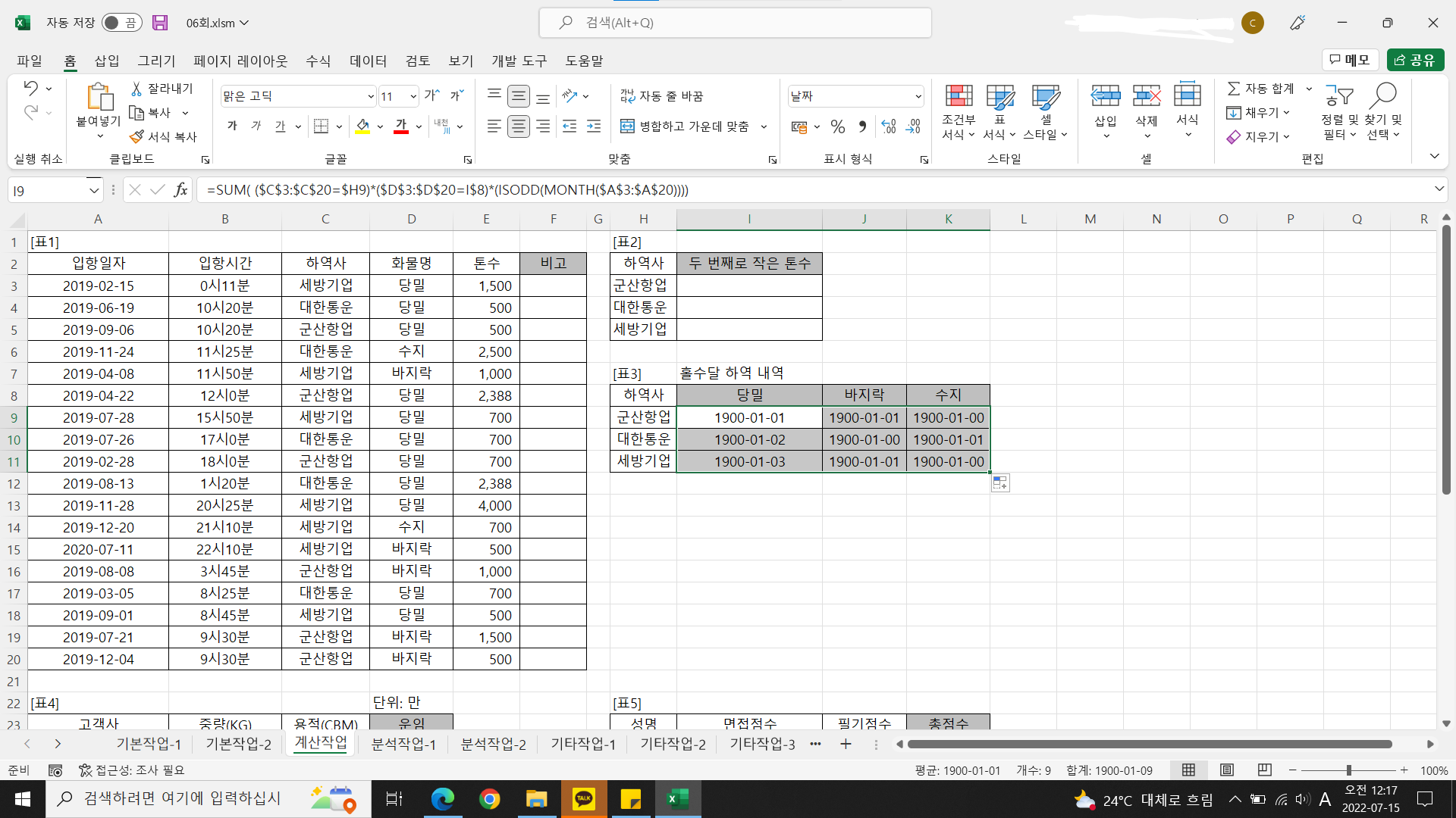 셀 서식을 일반으로 변경하면 정확한 결과가 나옵니다.