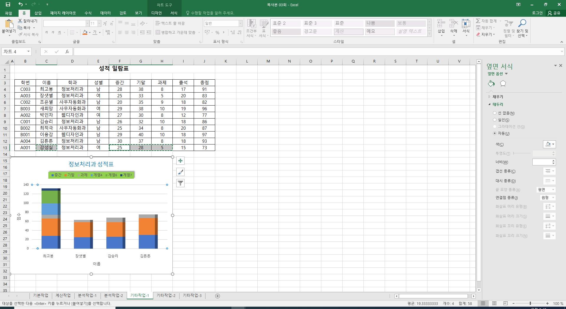 여기까진 잘 됐는데, 강성실의 데이터가 추가되지 않습니다. 답지에 적혀있는 복사 붙여넣기로 차트에 붙여넣으면