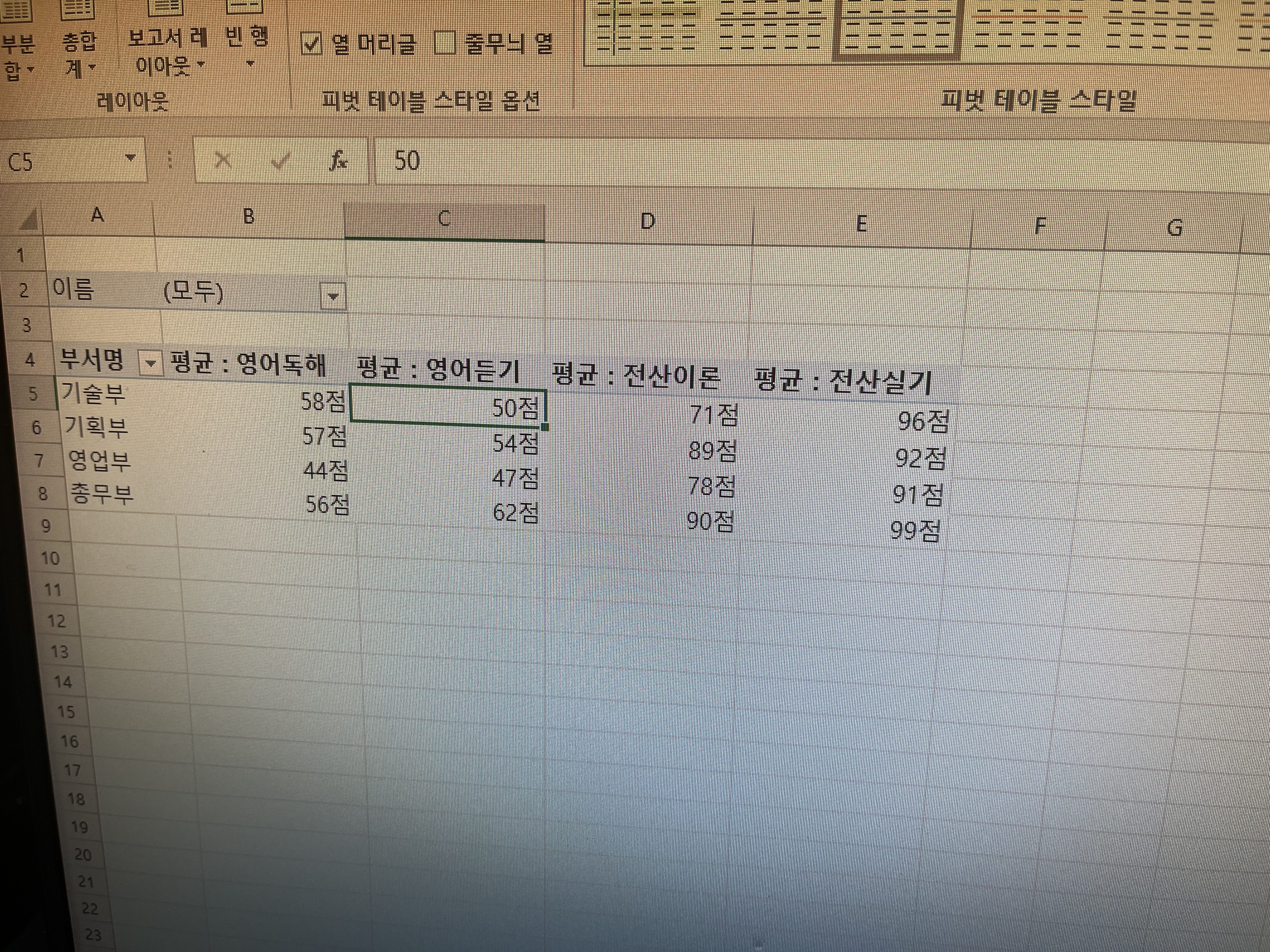 외부데이터 가져오기 할 때 문제에서 제시한 이름, 부서명, 영어독해, 영어듣기, 전산이론, 전산실기 열만 가져와서 작성해야 하는데 모든 내용을 가져와서 작성했기 때문에 결과가 다르게 표시된 것입니다.