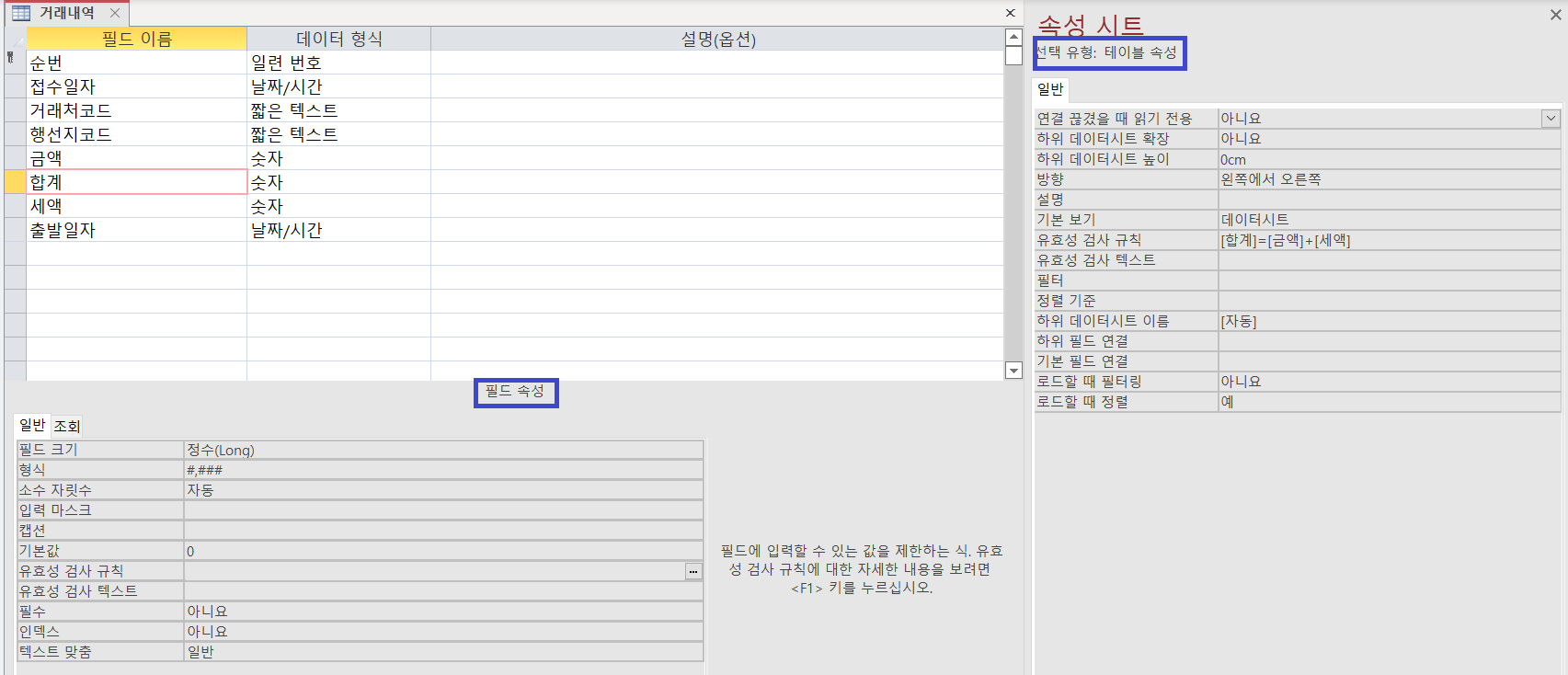 여기서 보면 합계 필드는 금액필드와 세액 필드의 합과 같다는 것인데 금액과 세액 모두 이 테이블에 있는 필드입니다.