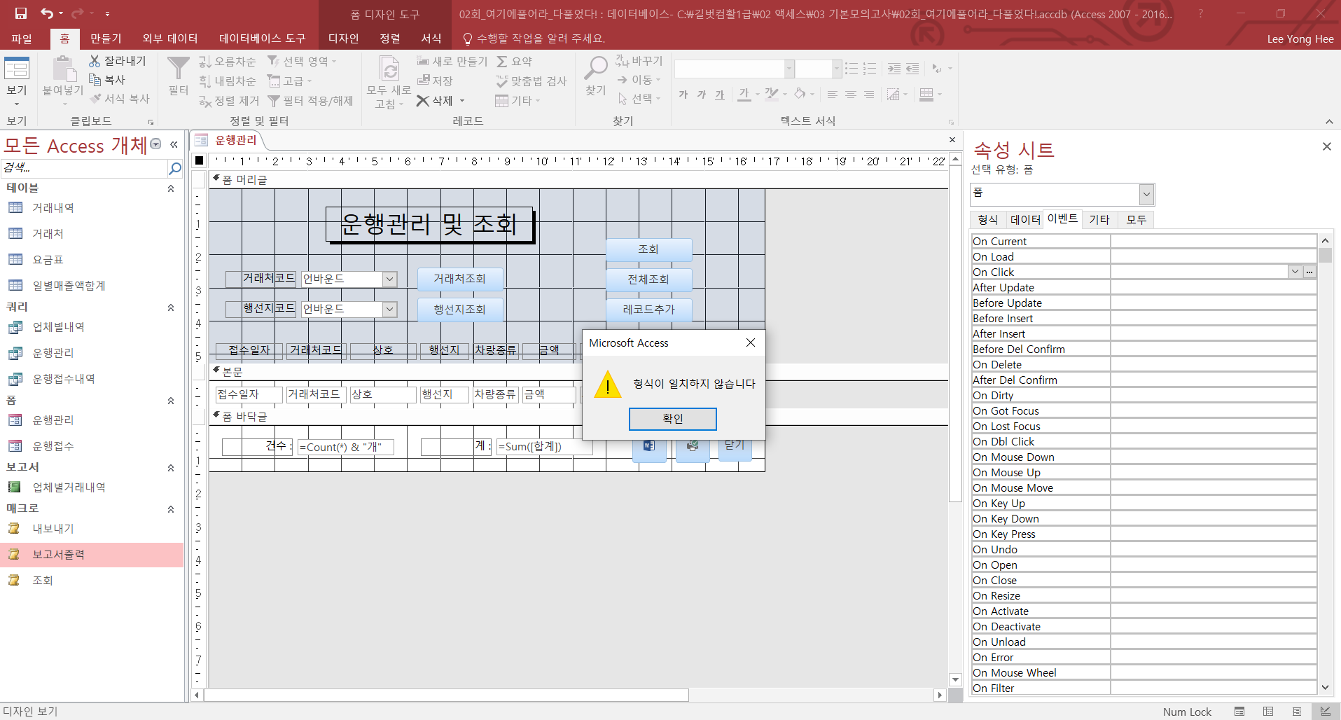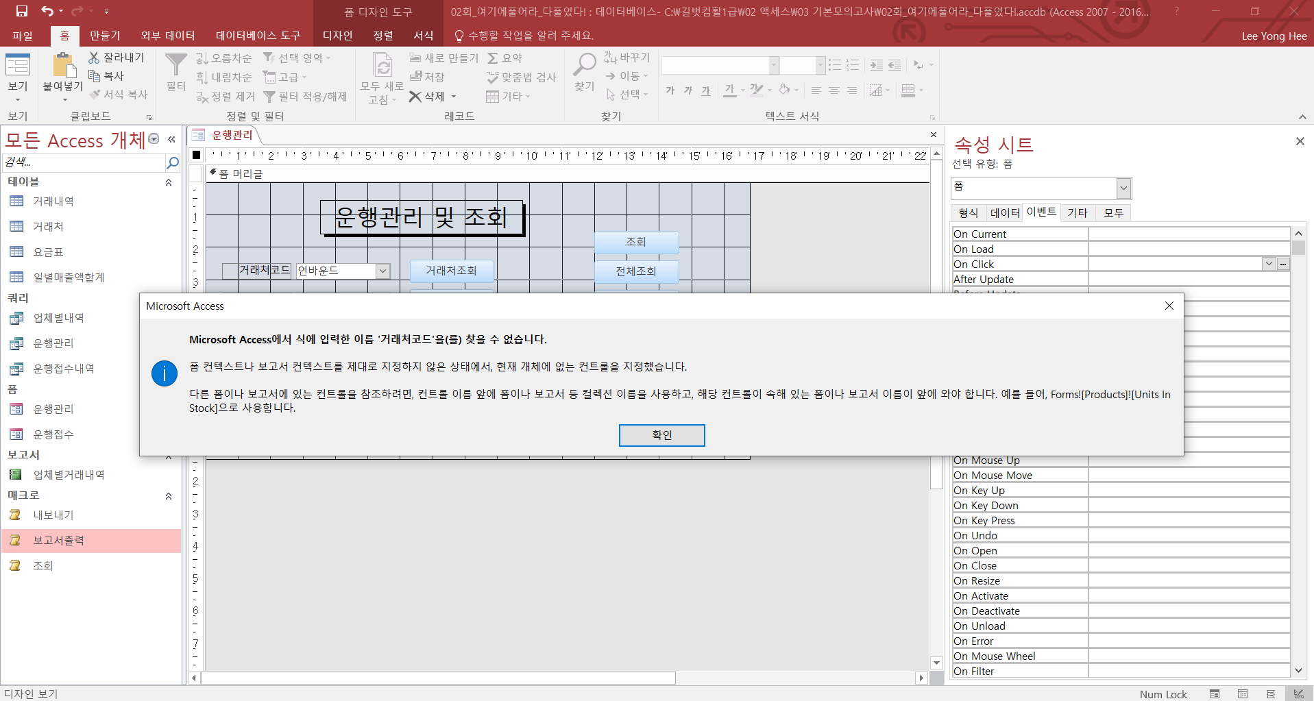 두번째 사진은 =Left([Forms]![운행관리]![거래처코드], 2)="AA" 라고 썼을 때의 오류창입니다.