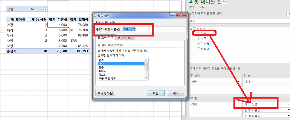 아래 그림과 같이 성명 필드를 끌어다 놓고 값필드 설정에서 사용자 지정이름에 직원수 로 변경 하세요 .