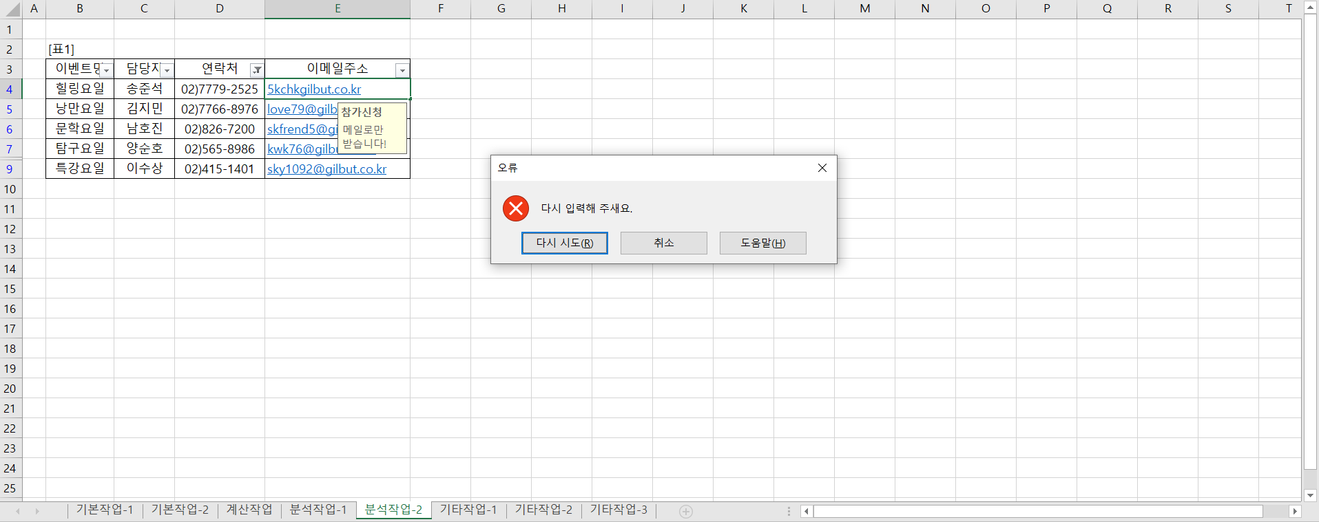 데이터 유효성 검사 오류 메세지에서 설정한 경고창(2번째 사진)이 아니라