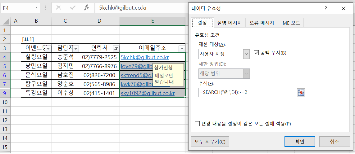 데이터 유효성 검사 수식을 교재168페이지와 똑같이 적었는데