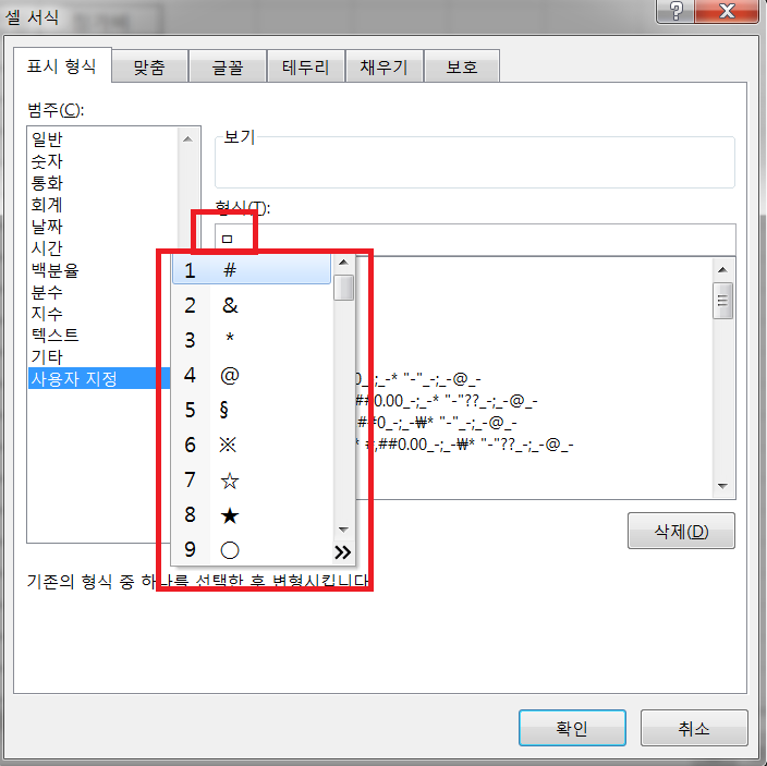 사용자 지정 표시 형식에서 특수 문자 입력할 때 쉽게 찾는 방법있나요?