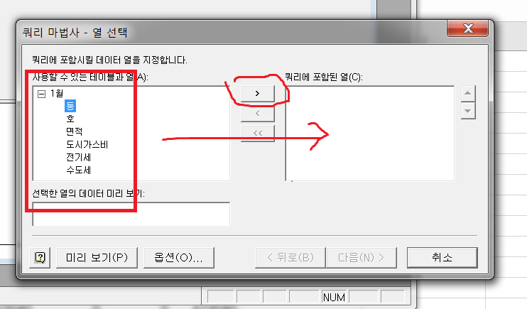 아래 그림과 같이 나타나면 동, 호, ... 순으로 필드를 추가한 후 다음을 눌러 대화상자가 끝날 때 까지 지정해 주세요.