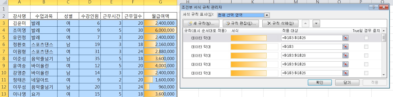 아래 와 같이 많은 조건부 서식이 지정된 것이 확인 됩니다.
