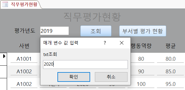 ② [평가년도]=[Forms]![직무평가현황]![txt조회]