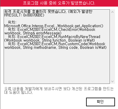 첨부 주신 파일 확인 결과, 해당 오류는 윈도우 환경 문제로 비쥬얼 베이직 쪽에서 오류가 발생한 것으로 보여집니다.