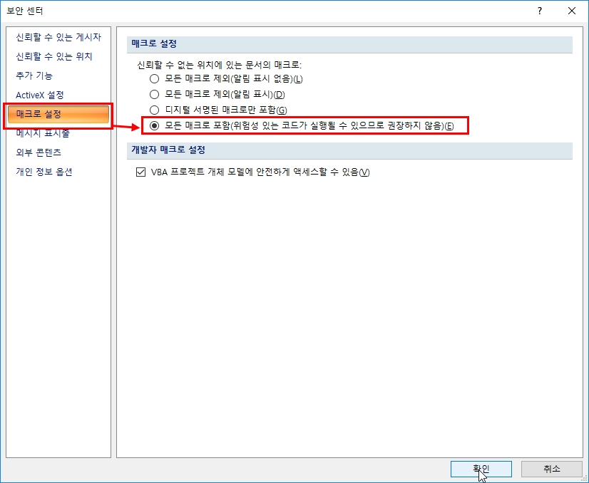 ‘매크로 설정’에서 ‘모든 매크로 개요(알림표시)’에 체크해주시면 됩니다.