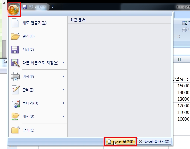 1 . 오피스 단추를 클릭한 다음 ‘Excel 옵션’을 클릭해주세요.