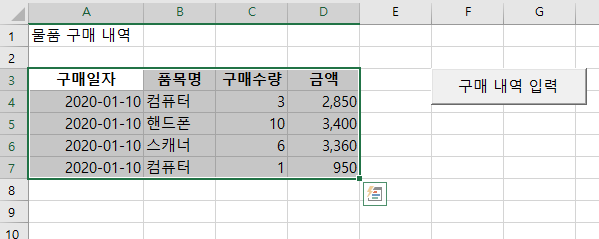 - ex. msgbox "총 구매건수는 " & [d3].currentRegion.Rows.Count - 1 &"건입니다.",vbOKOnly
