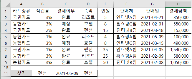내 풀이 : =INDEX(A2:H9, MATCH(MAX((A2:A9="국민카드")*H2:H9),(A2:A9="국민카드")*H2:H9,0),4)