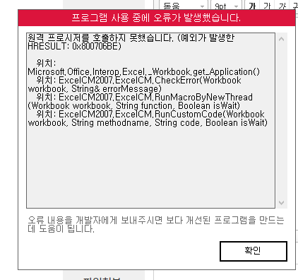 해당 오류는 윈도우 환경 문제로 비주얼 베이직 쪽에서 오류가 발생한 것으로 보여집니다.