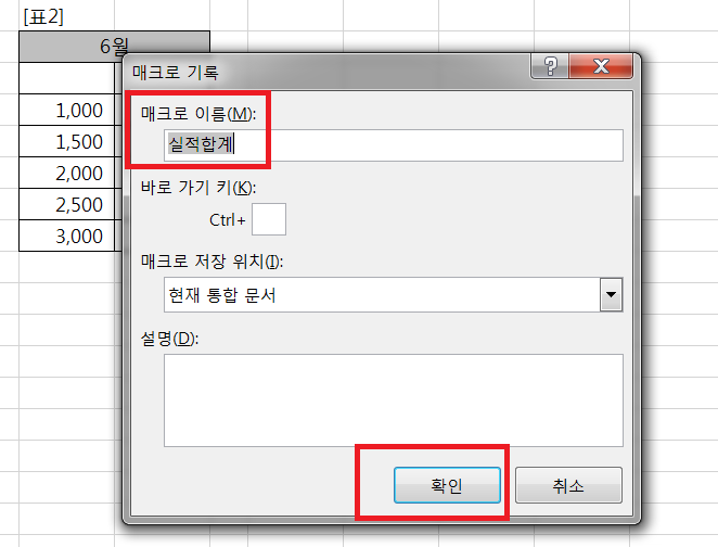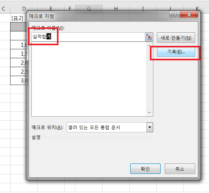2. 매크로 지정 대화상자의 매크로 이름에 실적합계를 입력하고 기록을 클릭 한다.