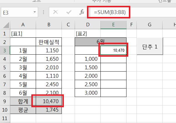 4. [b9] 셀의 수식 =sum(b3:b8)을 [e3]셀에 동일하게 입력한다.