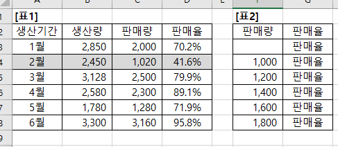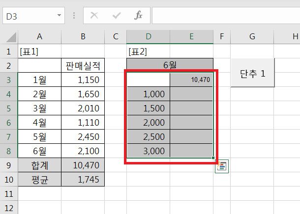 5. 데이터 표를 적용할 [d3:e8] 영역을 블록으로 지정한다