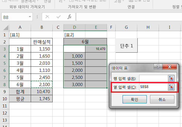 6. 데이터 표 대화상자에 그림과 같이 지정한 후 확인을 클릭 한다.