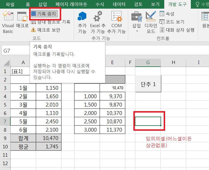 7. 임의의 셀을 클릭 한 후 기록중지(▣) 아이콘을 클릭 한다.