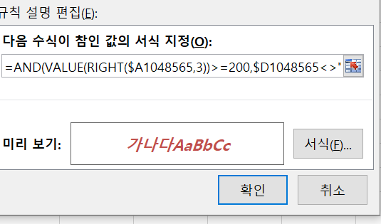 수식을 이렇게 작성하고 적용했는데, 서식이 지정이 안되어서 규칙관리에서 확인하니까
