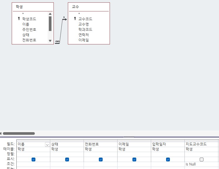 <교수>테이블의 '교수코드' 필드에 is null 조건이 들어가 있습니다.
