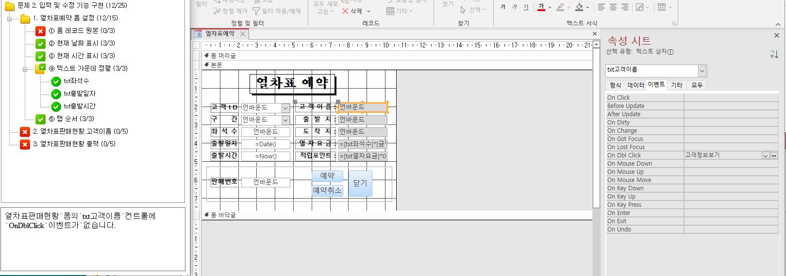 1. 이벤트 프로시저는 작성되어 있는게 맞습니다. 맞게 채점이 되어야 할 것 같습니다.