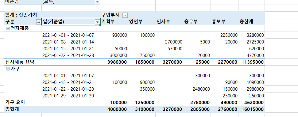 피벗테이블 그룹화에서 기준일 -> 오른쪽클릭 -> 그룹화 -> 일(기준일) 로 바뀌는데
