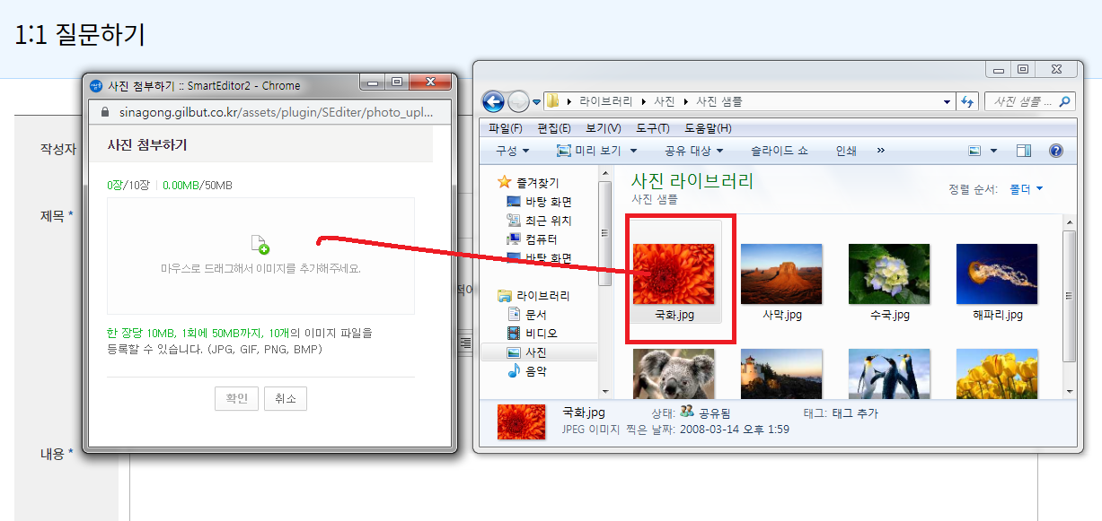 그리고, 여기서 사진을 첨부하라면 어떻게 해야 하는지 가르쳐주세요. 제가 오른쪽에 사진이라는 버튼을 클릭하면 '마우스로 드래그해서 이미지를 추가해주세요.'라는 문구가 있는데요, 어떻게 드래그해서 이미지를 추가하는지 모르겠습니다.