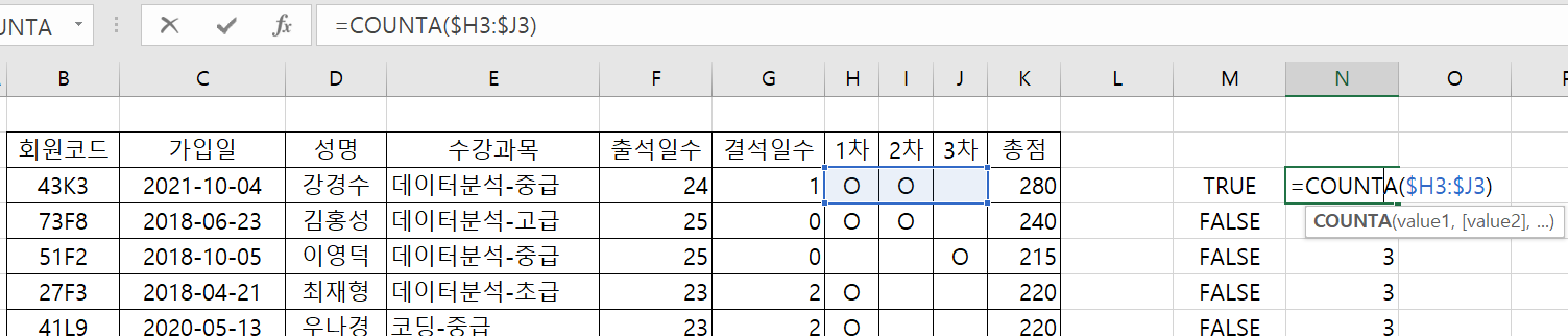 여기서 COUNTA($H3:$J3)의 결과값이 무조건 3으로 나오더라구요.