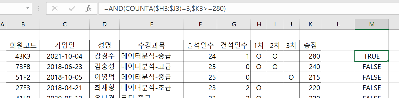 1번 문제 고급필터 식 답이 =AND(COUNTA($H3:$J3)=3,$K3>=280) 인데요,