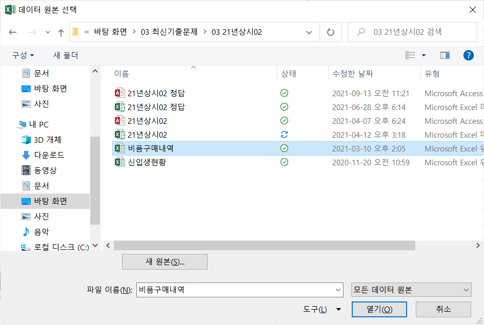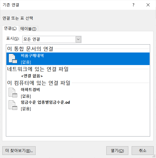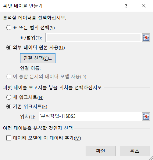 피벗테이블 작업하는데 외부데이터 원본사용-연결선택이 안됩니다.