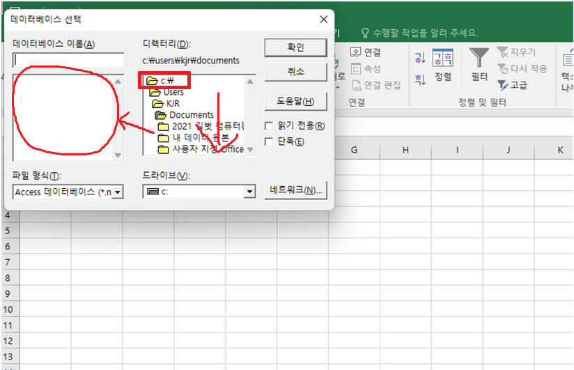 아래 그림과 같이 c:\ 더블클릭 후 데이터가 있는 곳의 폴더를 찾아줘야 내용이 표시됩니다.