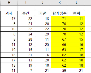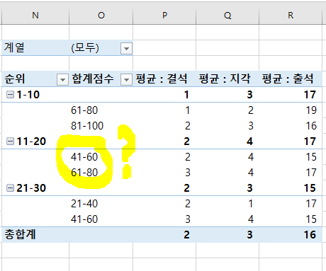 피벗 테이블을 작성한 [B2:L31] 영역을 순위와 합계점수 순으로 정렬한 후 보면 순위가 11~20위 안에 41~60에 해당하는 점수는 없으므로 피벗 테이블에 표시되지 않는 것이 맞습니다. 혹시 피벗 테이블을 외부 데이터인 성적관리.accdb를 이용하여 작성했다면 삭제한 후 해당 워크시트의 B2:L31 영역의 데이터를 이용하여 작성하세요.