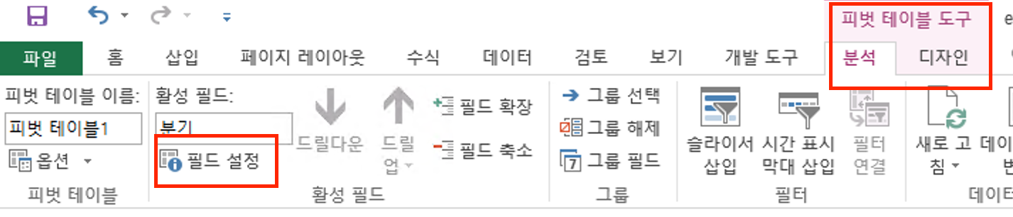 피벗 테이블을 선택하신 후 '피벗 테이블 도구 > 분석'에서 '활성 필드 > 필드 설정'을 누릅니다.