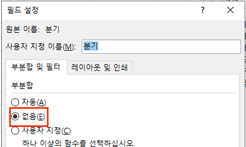 필드 설정창이 나오면 '부분합 및 필터'에서 부분합을 '없음'으로 선택하면 필드를 확장했을 때 값이 표시되지 않게 됩니다.