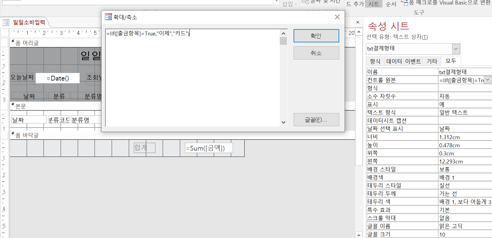 txt결제형태 컨트롤에는 출금항목 필드가 체크 표시되어 있으면