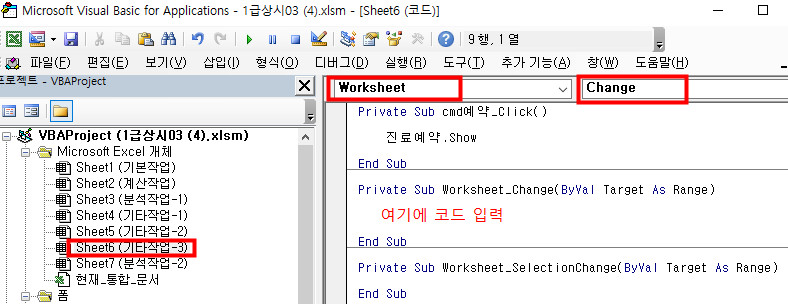 같은 기타작업 중 3-3문제에 '기타작업-3' 시트의 데이터가 변경(Change)되면 해당 셀의 글꼴을 '궁서체'로, 글꼴 크기가 12로 설정되도록 이벤트 프로시저를 작성하라고 하는데, alt+11을 누른 후, 왼쪽 MICROSOFT EXCEL개체에서 해당 작업을 수행하고 있는 Sheet6 (기타작업-3)을 클릭했는데 왼쪽에 자꾸 cmb예약이 뜨고 오른쪽에는 목록에 change가 없습니다. 어디서 잘못된 건가요?