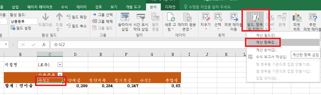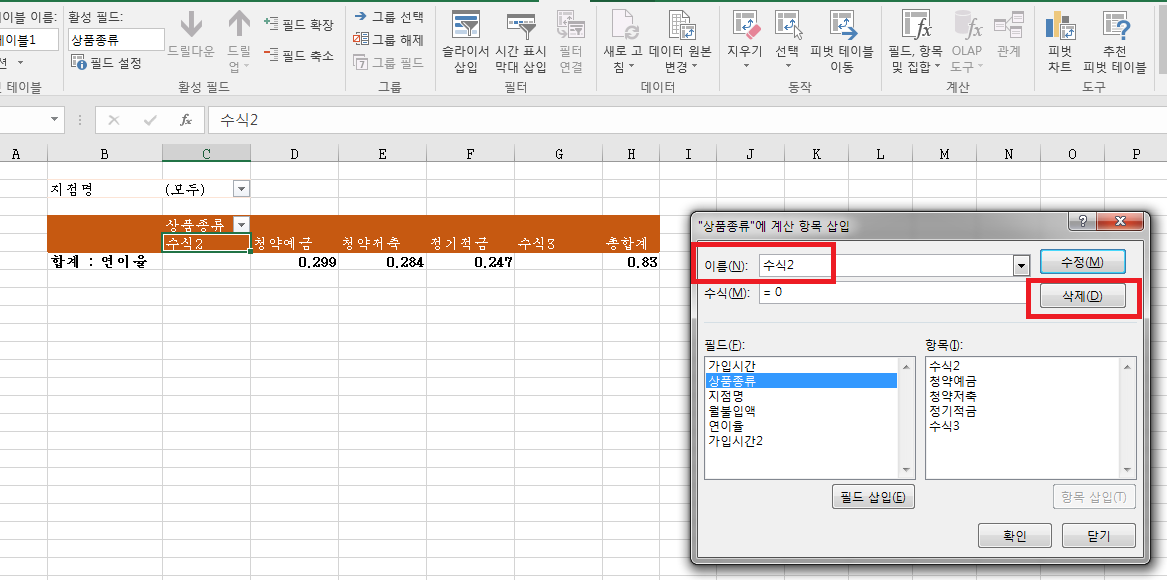 피벗테이블 작성 도중 수식1,수식2