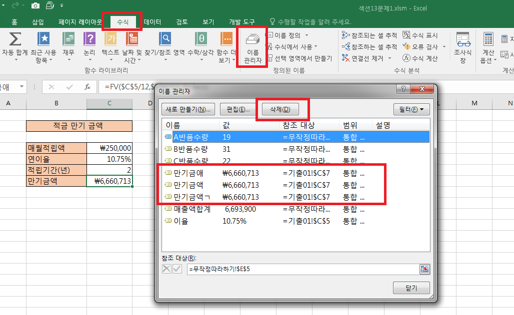 이미 지정된 만기금액 이름이 있기 때문에 지정이 안되는 것입니다.