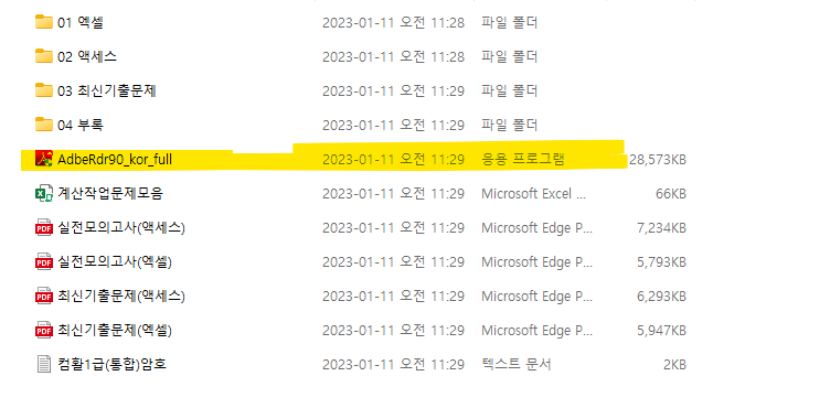 안녕하세요 1급 실기 14페이지에 나와있는대로 했는데 C:\아래에 길벗컴활1급 폴더가 생성되지 않아서 문의 드립니다. 제가 실행한 파일은 첨부파일에 형광펜으로 칠한 어도비 프로그램입니다.
