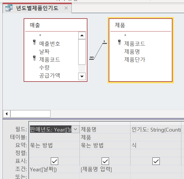 그룹 지정할때의 기준필드이면 묶는 방법으로 지정하시고 수식으로 작성할 경우 식으로 지정하시면 됩니다.
