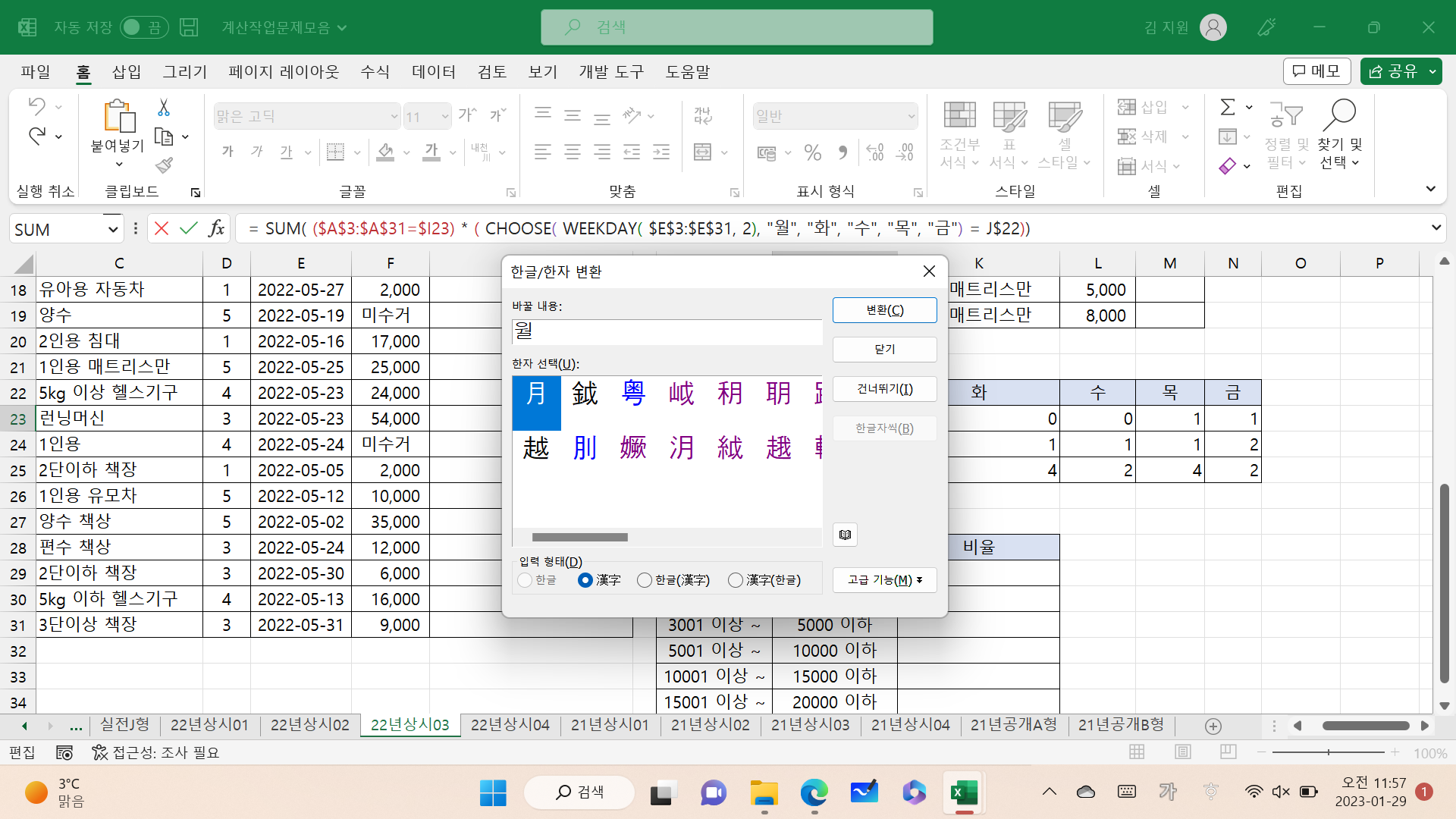 제목과 같이 배열수식을 만들기 위해 ctrl + shift + enter 를 누르면 한자 입력창이 떠요.