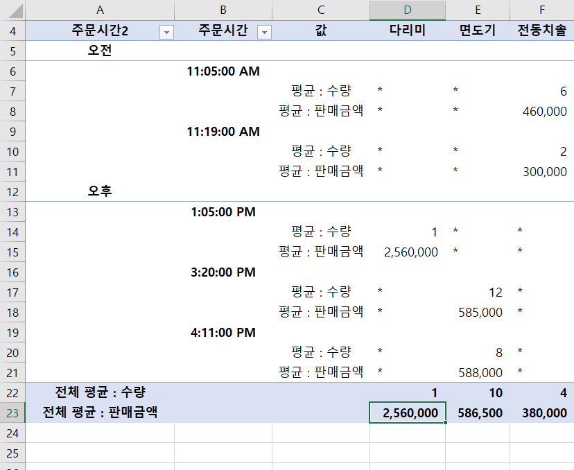 1. 피벗테이블의 d23셀의 너비를 조금 넓힌 후 확인 해 보세요.