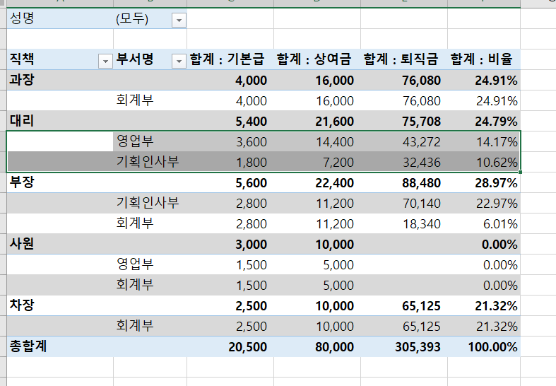 부서명 옆의 ▼ 을 누르면 오름차순 정렬이 가능합니다.